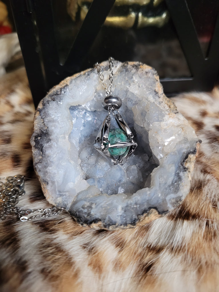 Vessel: Turquoise Jasper Sphere In A Metal Net Pendant