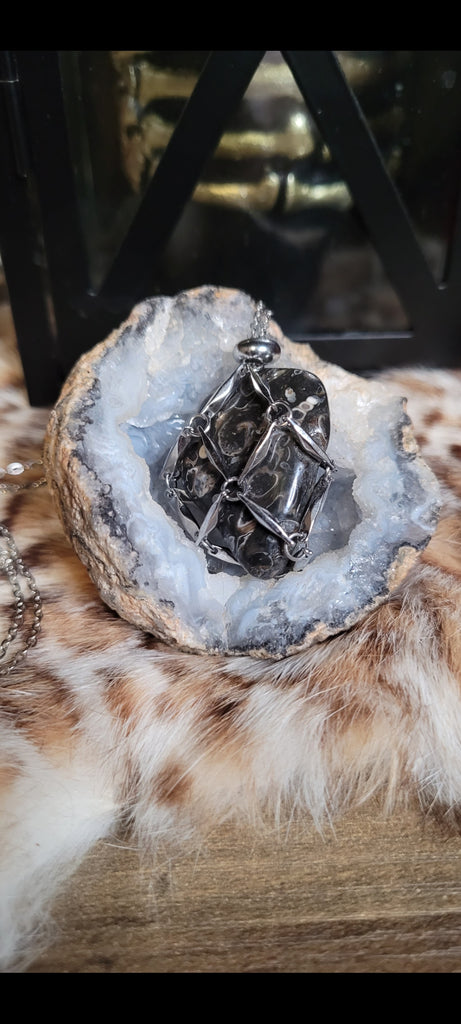 Vessel: Turtle Jasper In A Metal Net Pendant